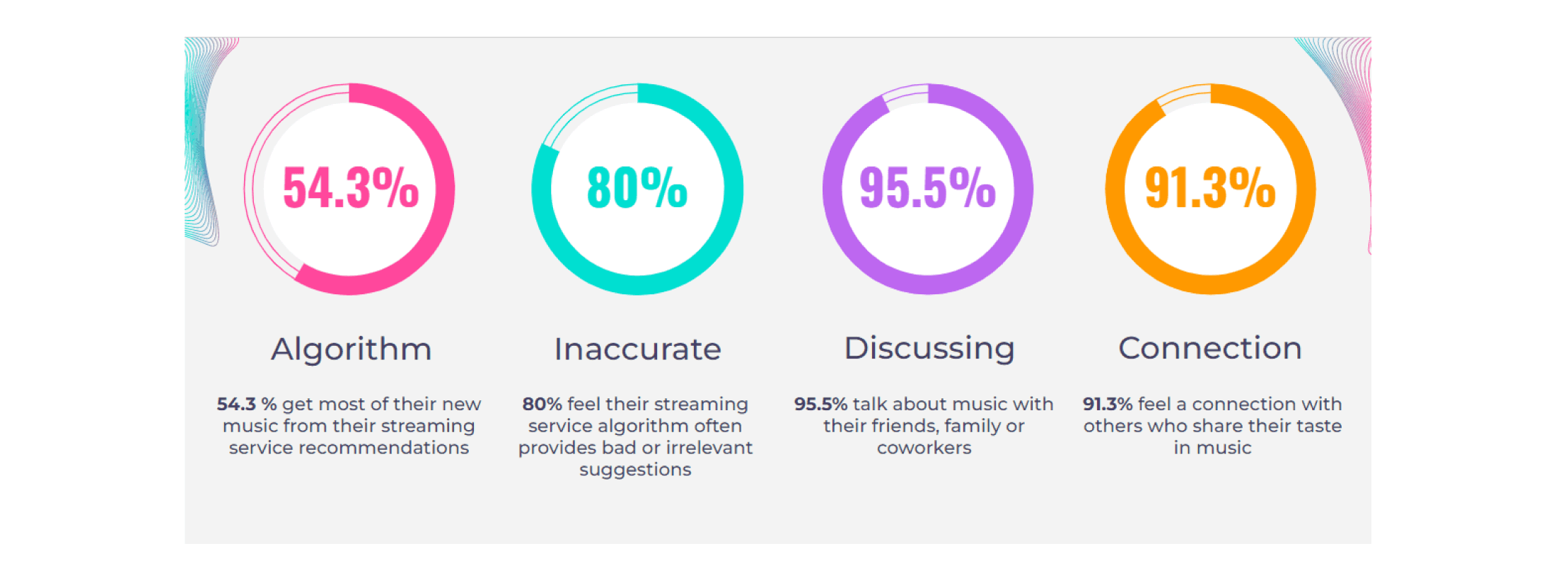 Above are some key metrics drawn from the survey. The two left-most are an interesting pair: 54% of respondents said they get most of their new music from their streaming service algorithm (think Spotify Discovery Weekly or Apple Music Radio stations). However, 80% of people said that they felt these recommendations were not truly representative of their music tastes. This clearly shows an overlap of people who feel their primary source of new music isn’t actually providing music they like.
