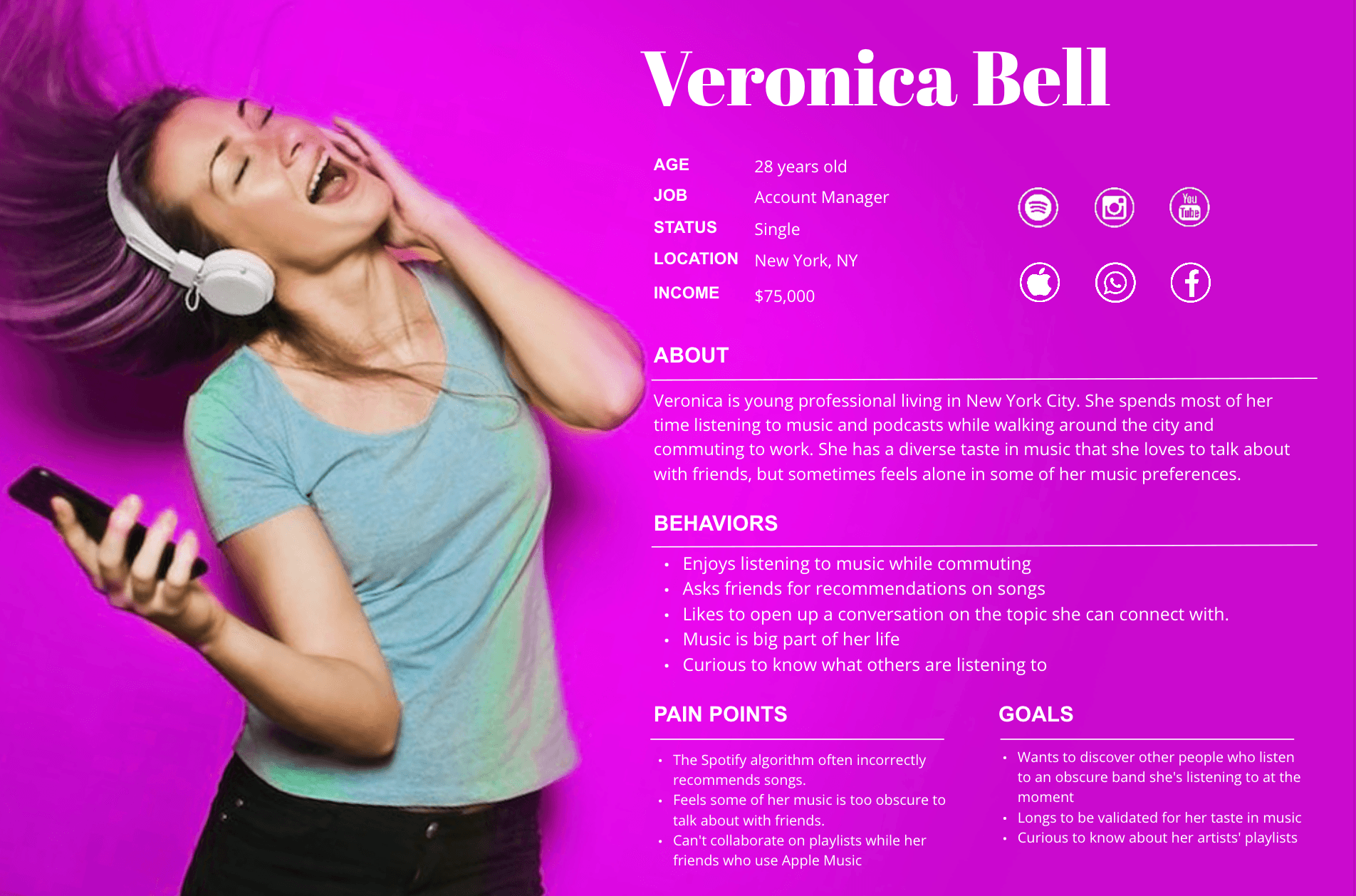 I then constructed a Persona to reflect a possible user for my finished product. This Persona is a social, young professional who enjoys listening to and discovering new music. However, she struggles with her Spotify algorithm and having a reliable way to share songs and playlists with her friends.