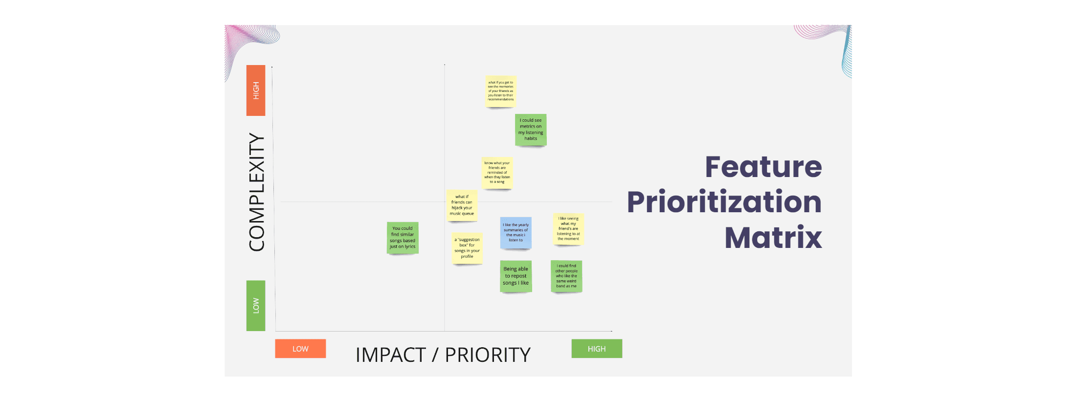 Utilizing both the Affinity Diagram and my User Persona, I conducted several other exercises as part of of the Ideation phase. These included an 'I Like, I Wish, What If?' exercise to identify possible features, a Competitor Analysis to understand pros and cons of similar products, a Storyboard to visualize an actual scenario our Persona might encounter, and finally the Feature Prioritization Matrix shown above to rank functionality ideas.