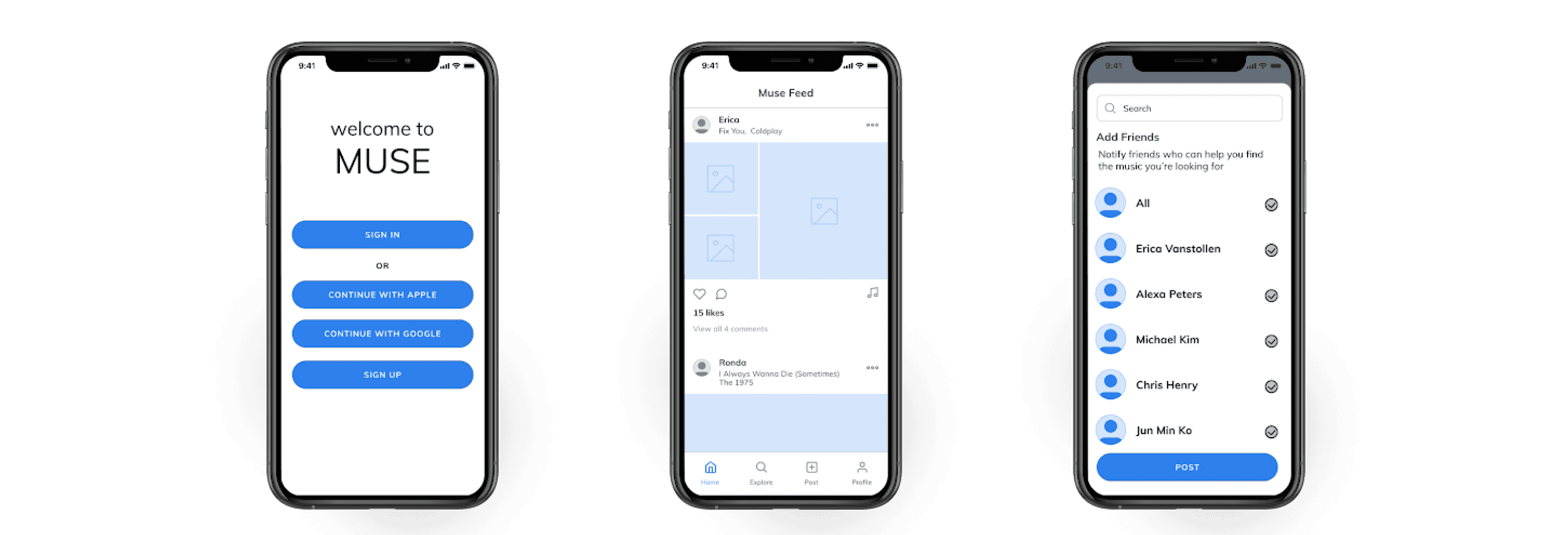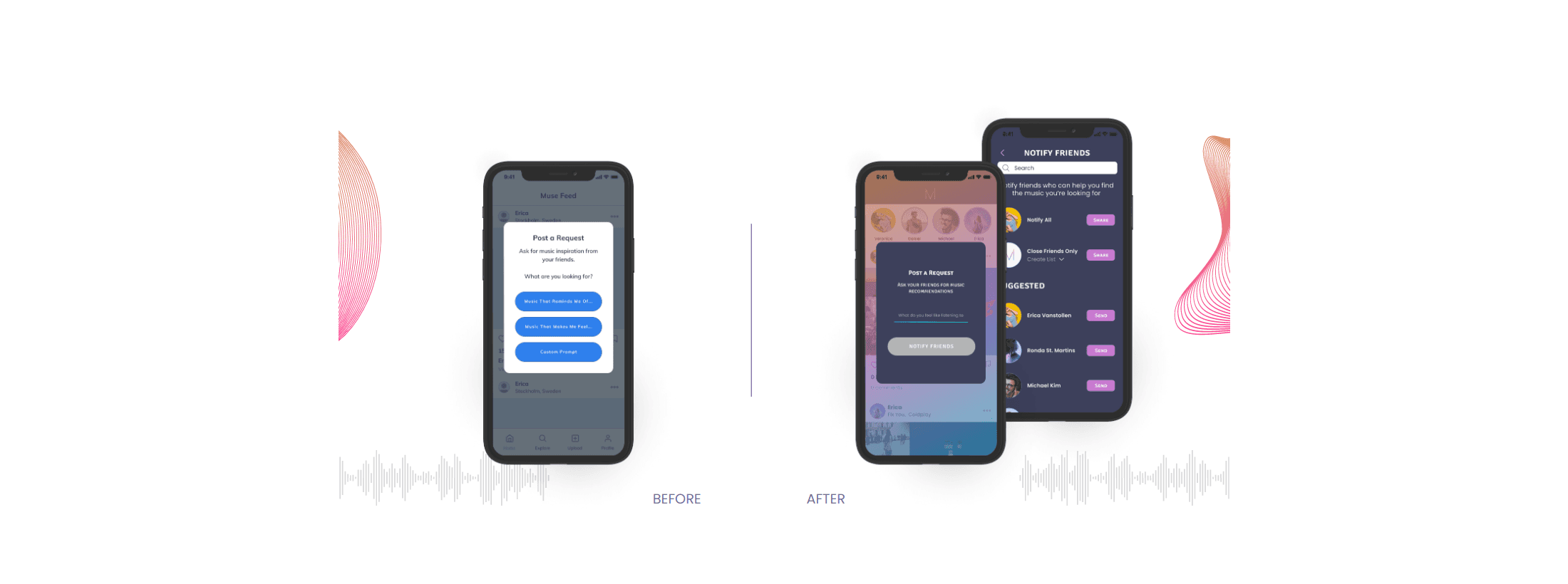 Many of the elements users navigated successfully were functionalities they had experienced in other apps, specifically social media features like curating their home feed and making a post. However, some tasks they struggled were activities unique to Muse: submitting a request to their friends for music and integration with their music streaming service. I focused on simplifying the language and flow associated with these workflows in addition to optimizing how they were explained in the onboarding tutorial.