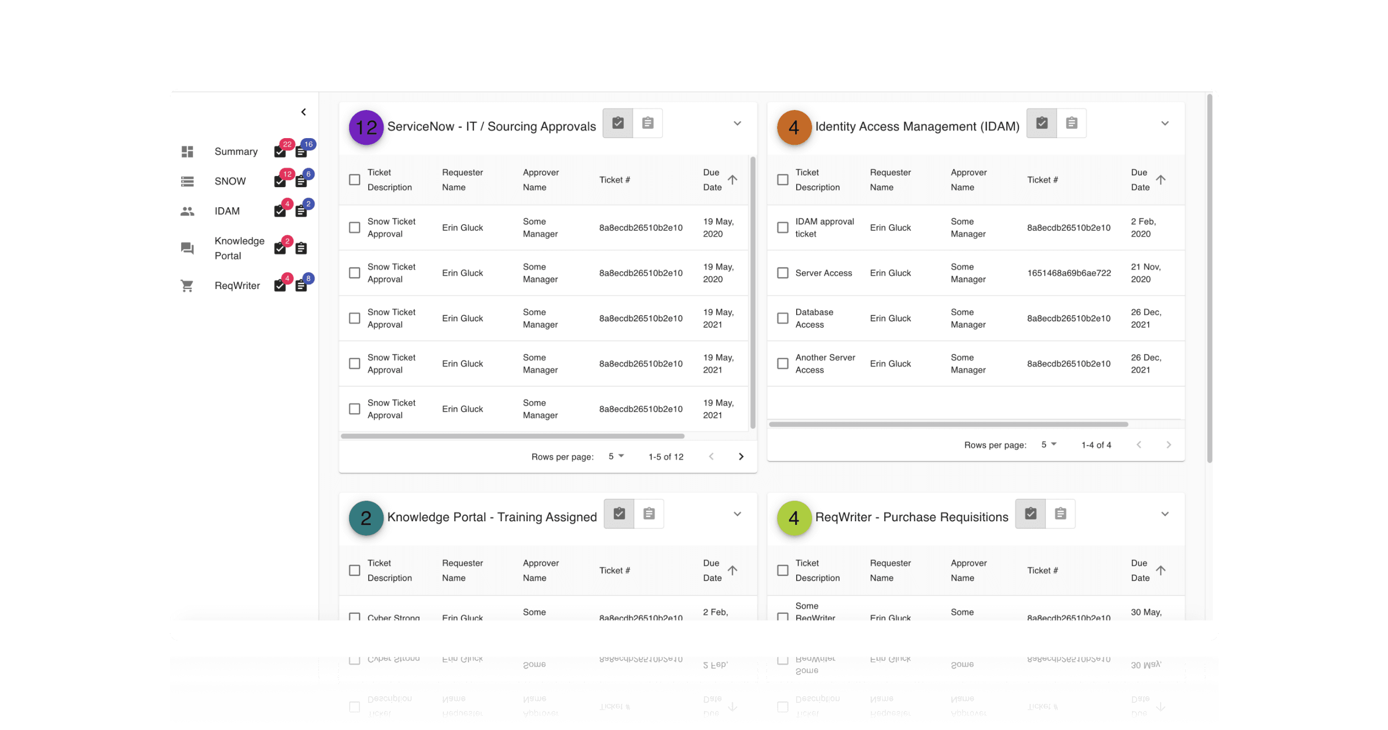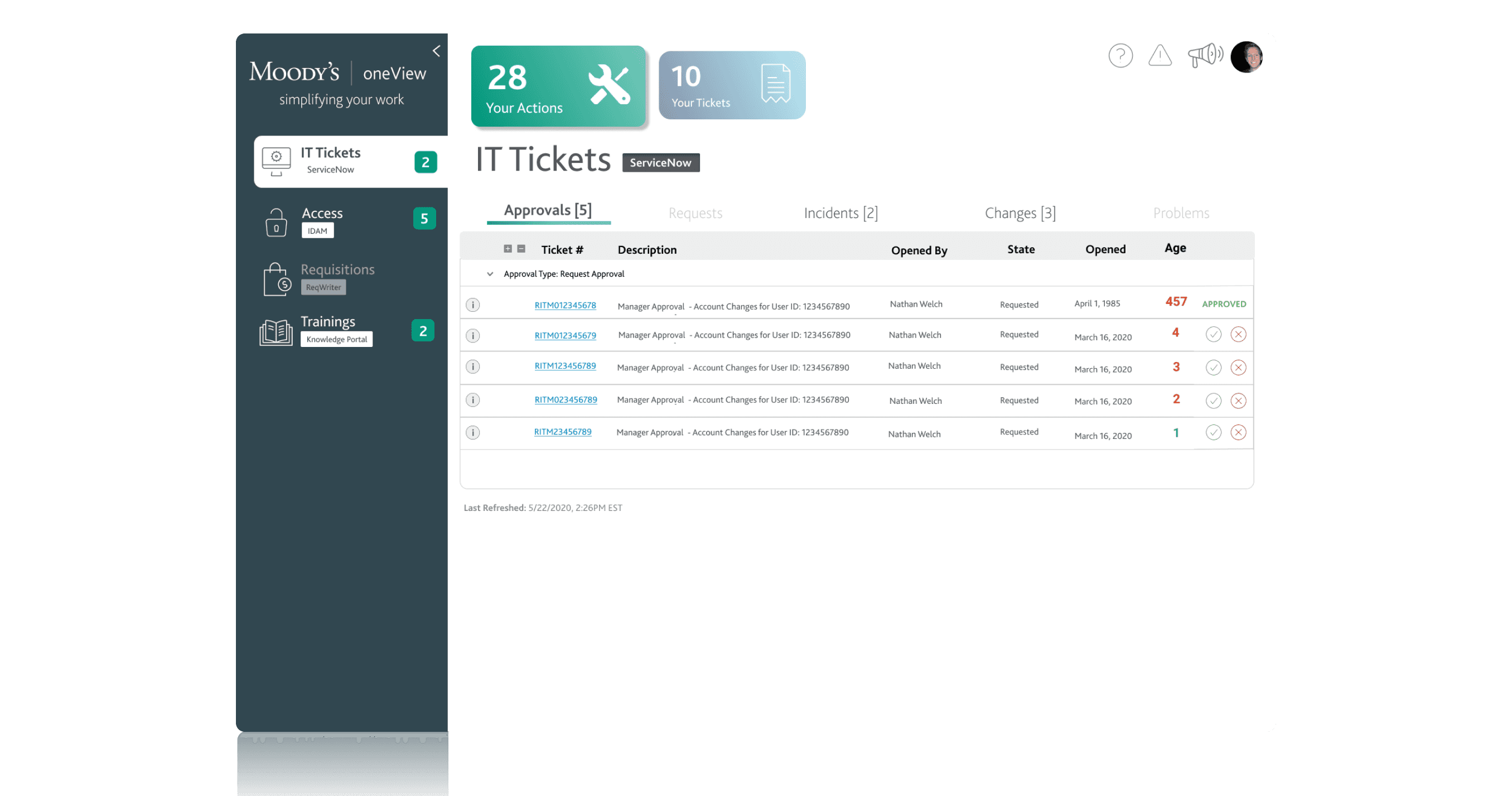 Our refined prototypes began to take shape around the feedback and insights we’d gathered. Each system grid was simplified and presented one at a time to reduce overload. Users could easily toggle between Actions and Tickets at the top of the page, and new calls to action were introduced in the form of contextual buttons and modals. Ticket numbers became hyperlinks to their source systems, and actions like approving or rejecting requests could now be completed directly within oneView.