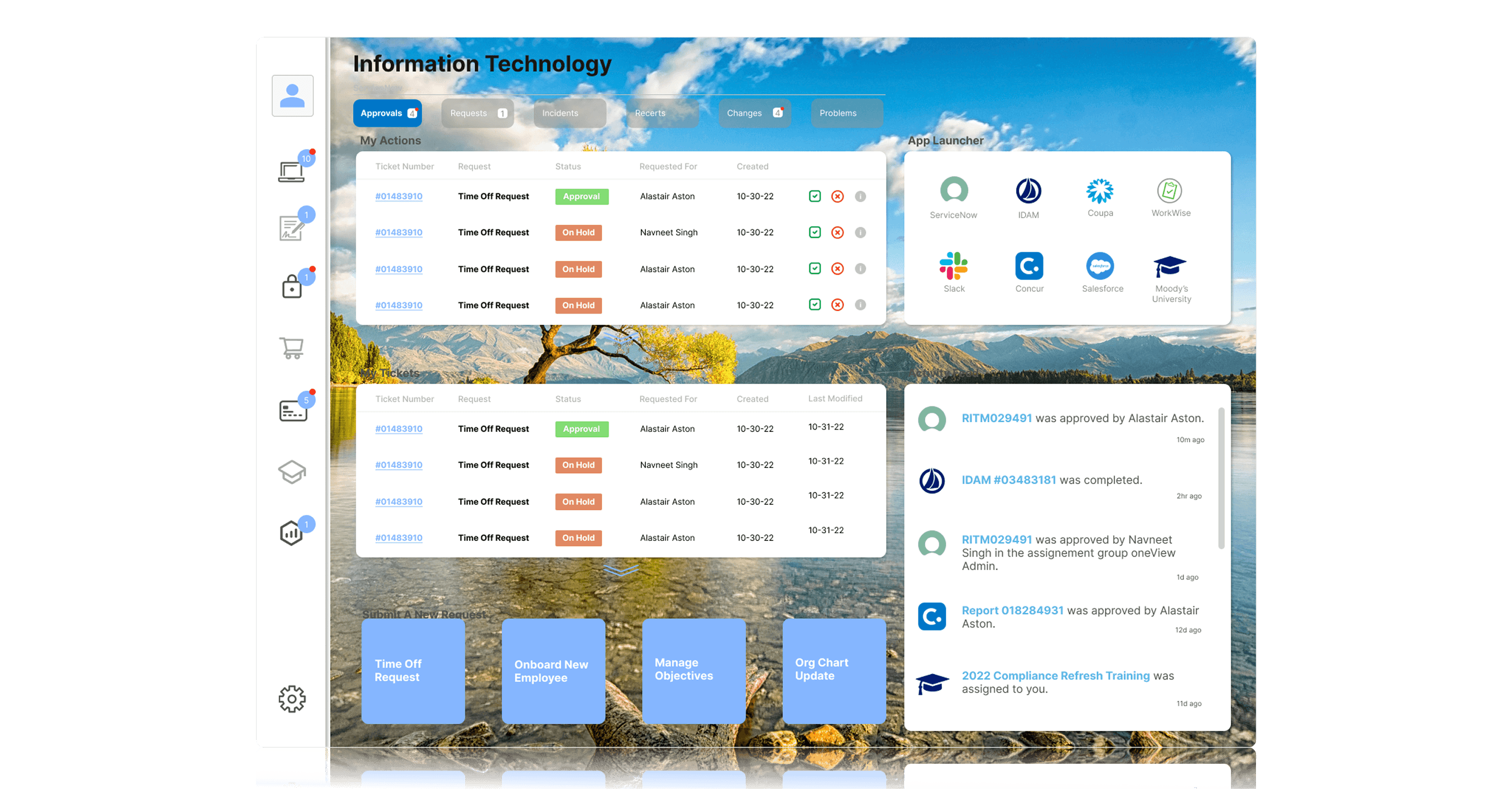 The concept that emerged was “oneView” — a unified, streamlined interface that would act as a single pane of glass into a user’s pending approvals and ticket history. But our first design iterations tried to do too much, all at once. The earliest prototype crammed every system into a single, scroll-heavy dashboard. Information was buried, the interface was dense and unreadable, and there was no way to prioritize what mattered most. There was no hierarchy, no clear calls to action, and certainly no scalability.